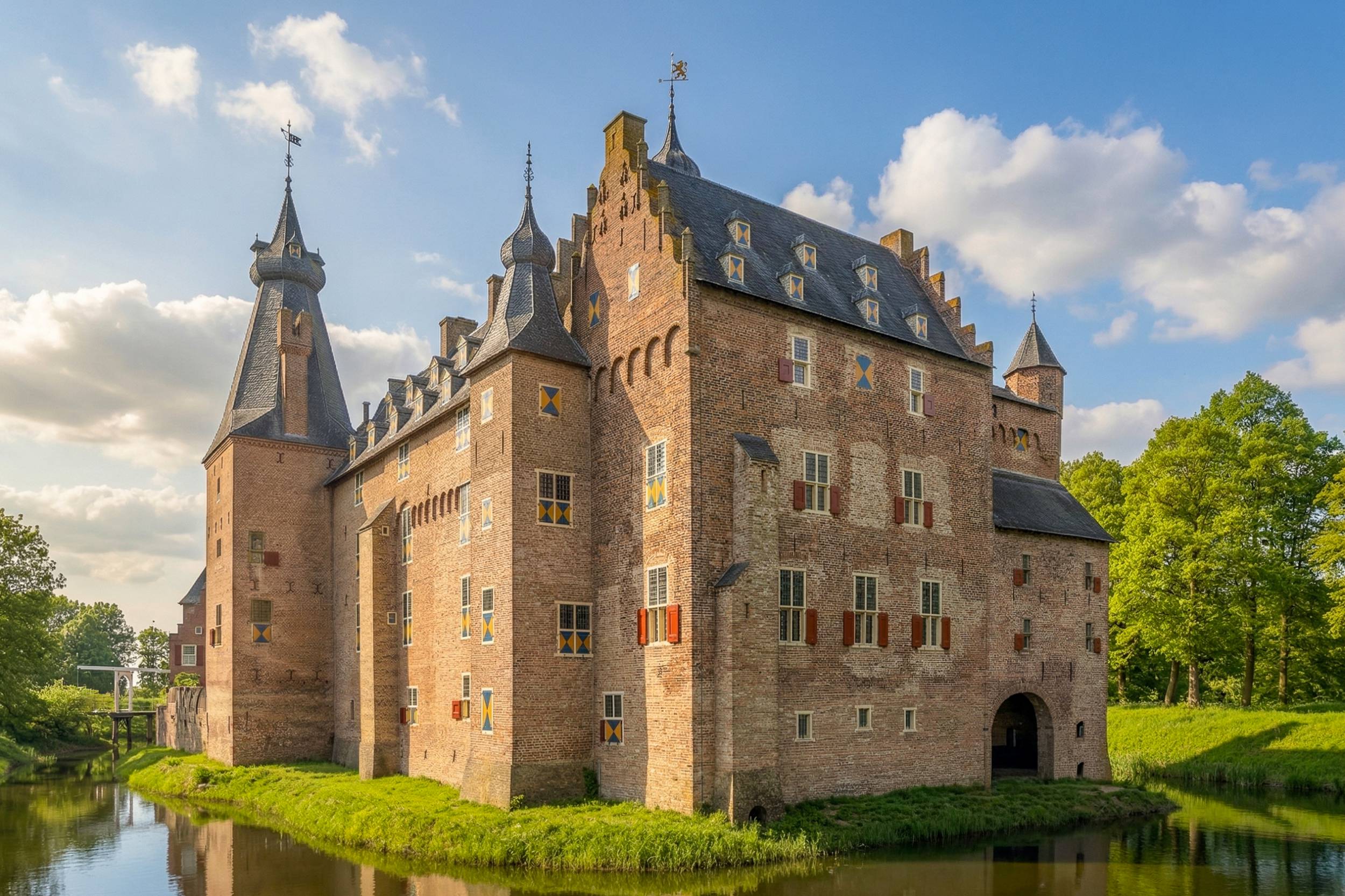 Op deze foto zie je Kasteel Doorwerth, een indrukwekkend kasteel omringd door water en groen. De stevige bakstenen muren, torens en de toegangspoort geven het geheel een krachtig en herkenbaar beeld.