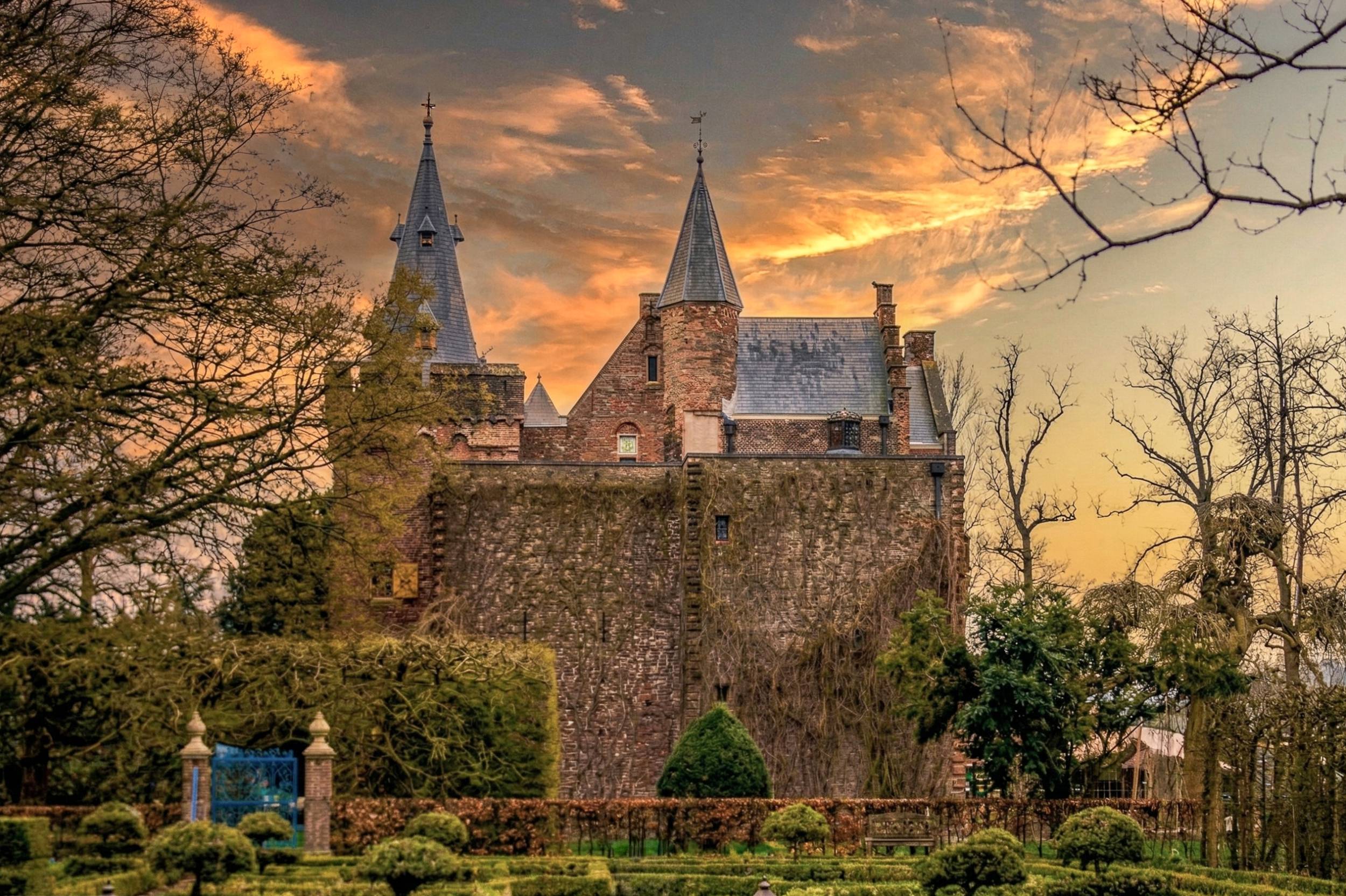 Op deze foto zie je Kasteel Sypesteyn, statig gelegen achter een groene tuin met strak gesnoeide hagen en oude bomen. De robuuste muren en torens steken mooi af tegen de warme lucht van de ondergaande zon.