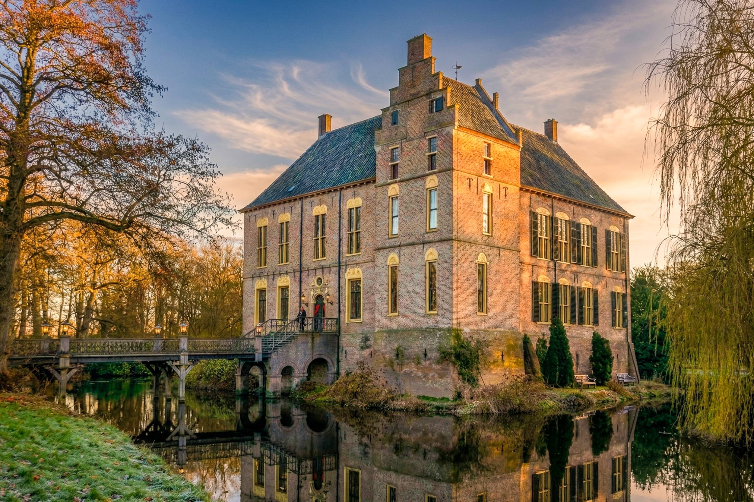 Op deze foto zie je Kasteel Vorden, prachtig gelegen aan het water en bereikbaar via een karakteristieke brug. Het statige gebouw met zijn warme bakstenen gevel en groene luiken weerspiegelt mooi in de gracht. Het zachte avondlicht geeft de foto een warme en rustige sfeer. De spiegeling in het water en de omliggende natuur zorgen voor diepte en balans, waardoor het beeld direct blijft boeien.